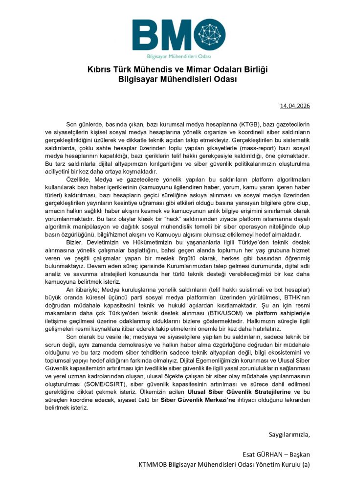 Son günlerde, basında çıkan, bazı kurumsal medya hesaplarına (KTGB), bazı gazetecilerin ve siyasetçilerin kişisel sosyal medya hesaplarına yönelik organize ve koordineli siber saldırıların gerçekleştirildiğini üzülerek ve dikkatle teknik açıdan takip etmekteyiz. Gerçekleştirilen bu sistematik saldırılarda, çoklu sahte hesaplar üzerinden toplu yapılan şikayetlerle (mass-report) bazı sosyal medya hesaplarının kapatıldığı, bazı içeriklerin telif hakkı gerekçesiyle kaldırıldığı, öne çıkmaktadır. Bu tarz saldırılarla dijital altyapımızın kırılganlığını ve siber güvenlik politikalarımızın oluşturulma aciliyetini bir kez daha ortaya koymaktadır.