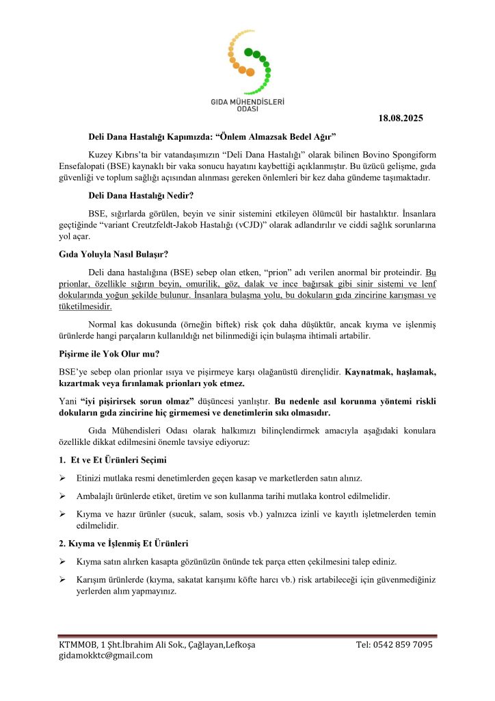 Kuzey Kıbrıs’ta bir vatandaşımızın “Deli Dana Hastalığı” olarak bilinen Bovino Spongiform Ensefalopati (BSE) kaynaklı bir vaka sonucu hayatını kaybettiği açıklanmıştır. Bu üzücü gelişme, gıda güvenliği ve toplum sağlığı açısından alınması gereken önlemleri bir kez daha gündeme taşımaktadır.