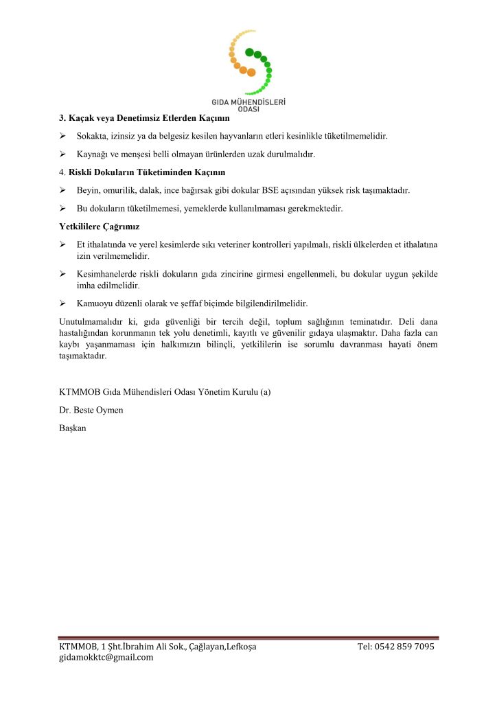 Unutulmamalıdır ki, gıda güvenliği bir tercih değil, toplum sağlığının teminatıdır. Deli dana hastalığından korunmanın tek yolu denetimli, kayıtlı ve güvenilir gıdaya ulaşmaktır. Daha fazla can kaybı yaşanmaması için halkımızın bilinçli, yetkililerin ise sorumlu davranması hayati önem taşımaktadır.