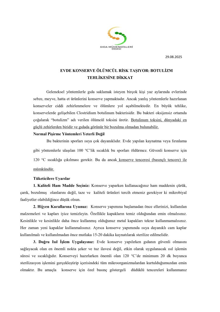 Geleneksel yöntemlerle gıda saklamak isteyen birçok kişi yaz aylarında evlerinde sebze, meyve, hatta et ürünlerini konserve yapmaktadır. Ancak yanlış yöntemlerle hazırlanan konserveler ciddi zehirlenmelere ve ölümlere yol açabilmektedir. En büyük tehlike, konservelerde gelişebilen Clostridium botulinum bakterisidir. Bu bakteri oksijensiz ortamda çoğalarak “botulizm” adı verilen ölümcül toksini üretir. Botulinum toksini, dünyadaki en güçlü zehirlerden biridir ve gıdada görünür bir bozulma olmadan bulunabilir.