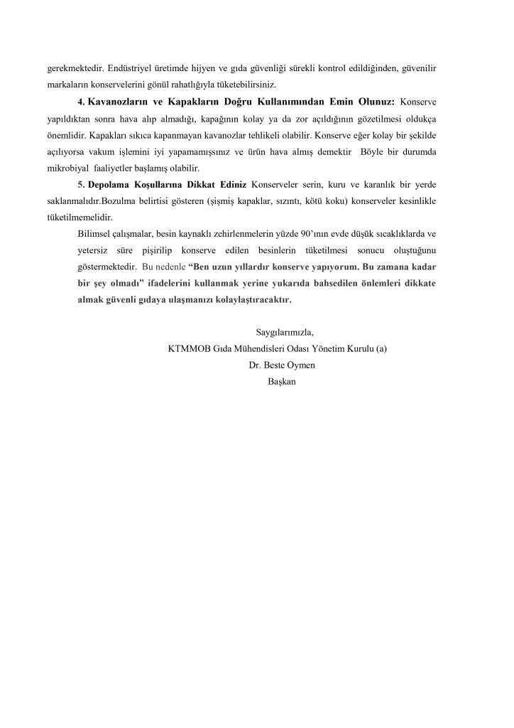 Bilimsel çalışmalar, besin kaynaklı zehirlenmelerin yüzde 90’ının evde düşük sıcaklıklarda ve yetersiz süre pişirilip konserve edilen besinlerin tüketilmesi sonucu oluştuğunu göstermektedir.  Bu nedenle “Ben uzun yıllardır konserve yapıyorum. Bu zamana kadar bir şey olmadı” ifadelerini kullanmak yerine yukarıda bahsedilen önlemleri dikkate almak güvenli gıdaya ulaşmanızı kolaylaştıracaktır.