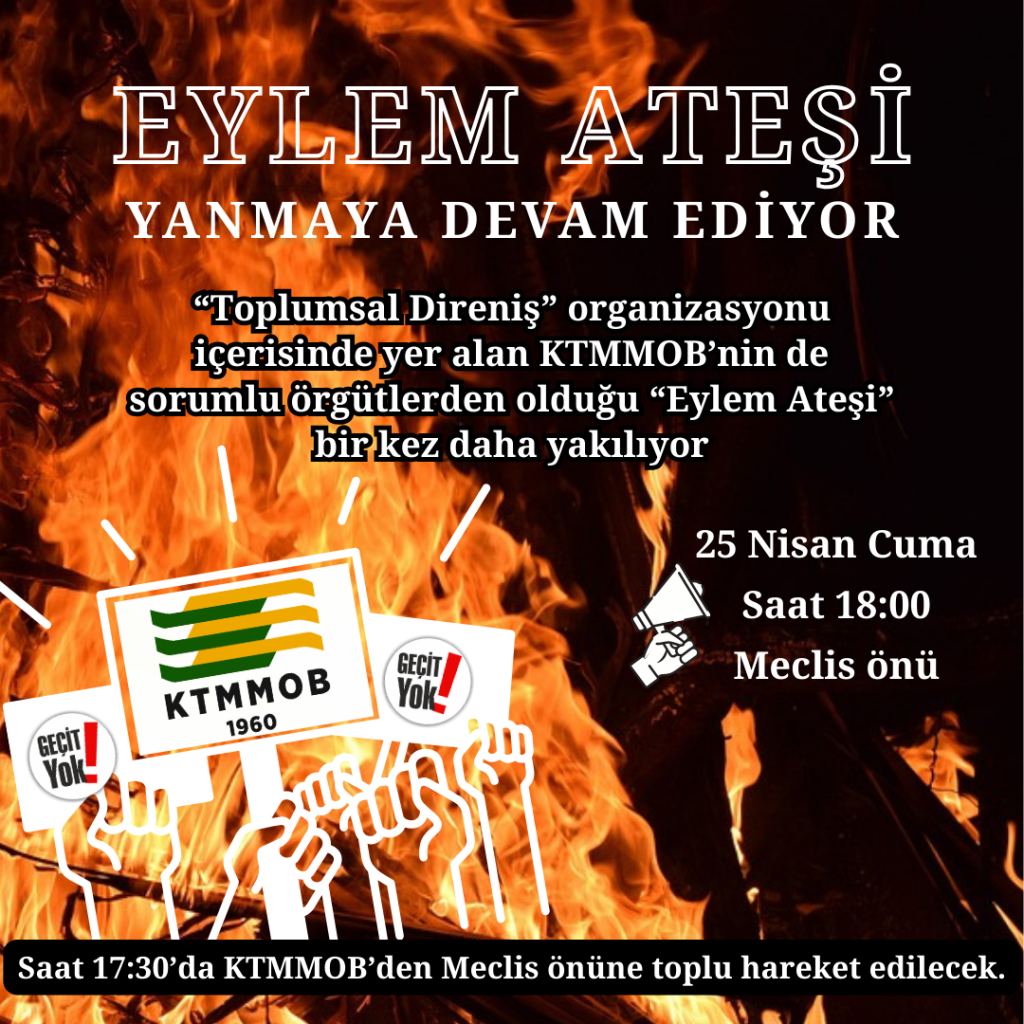 “Toplumsal Direniş” organizasyonu içerisinde yer alan KTMMOB’nin de sorumlu örgütlerden olduğu 25 Nisan Cuma günü 18:00’de Lefkoşa’da Meclis önünde eylem ateşi bir kez daha yakılacak.