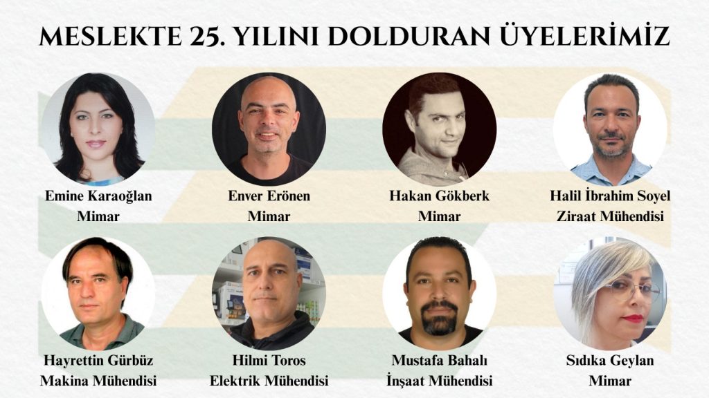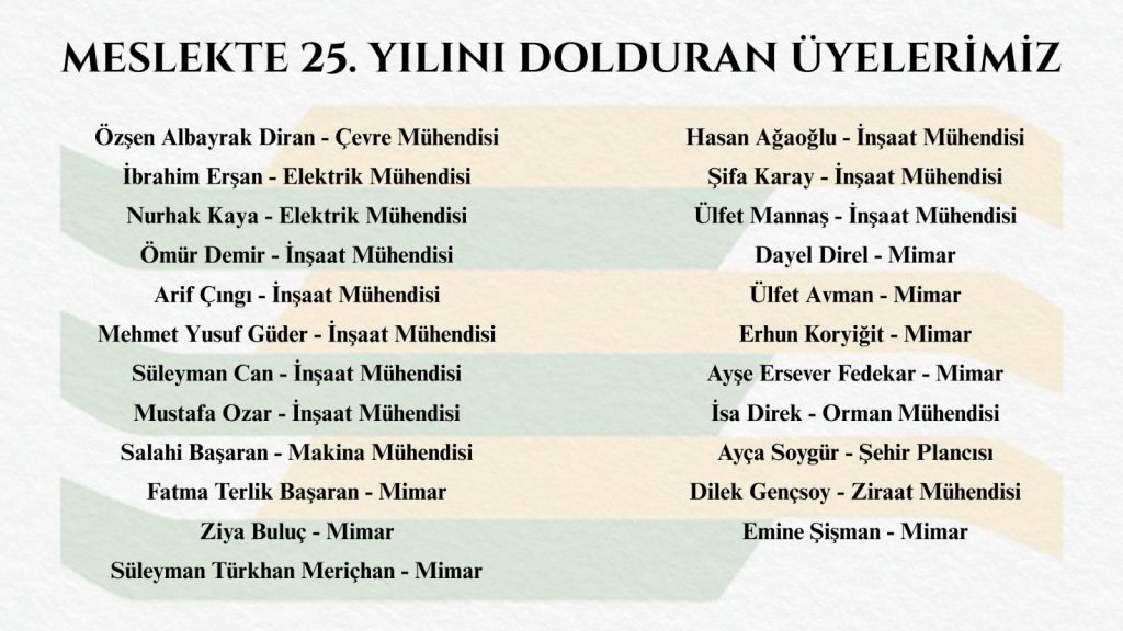 KTMMOB, KURULUŞUNUN 65. YILI NEDENİYLE DÜZENLEDİĞİ RESEPSİYONDA MESLEKTE 50. YILINI TAMAMLAYAN ÜYELERE PLAKET TAKDİMİNDE BULUNDU Resepsiyonda 50. Yıl plaketi alan üyelerimizin fotoğraflarını…