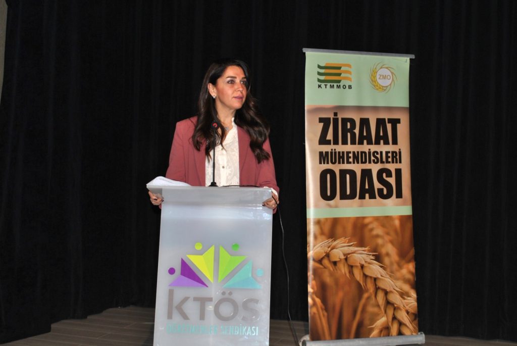 Erkut Uluçam konuşmasında, “bölgemizde savaş ortamının yaşandığı bugünlerde enerji maliyetleri arttı ve daha da artacağı aşikardır. Böyle bir ortamda üretimde enerji maliyetinin başında gelen elektrik enerjisinde, yenilenebilir enerji kaynaklarının kullanımı ile ilgili üretim kesimine kota ayrılması, hatta gerek kredi gerek hibe desteği ile yenilenebilir enerji yatırım maliyetleri desteklenmelidir. Kaldı ki, ülkemizde tam tersi yapılarak marketlere, benzin istasyonlarına, bankalara hatta gece kulüplerine yenilenebilir enerji yatırımı için izinler verilmektedir. Bu kabul edilir bir durum değildir. Herhangi bir üretici yenilenebilir enerji yatırımı yapmak istese yetkililer tarafından kotanın dolduğu söylenerek maalesef izin verilmemektedir. Hatta üretim sektörü dışında verilen izinlerin yasal olmadan verildiği tartışmalara açıktır. Tarım topraklarının korunması için yıllarca ses verdik, çağrı yaptık hatta geçmişte hazırlanan Toprak Koruma Yasa Tasarısının tekrardan revize edilerek Meclis gündemine getirilmesi konusunda birçok kez çağrı yapmamıza rağmen yetkililer tarafından hiçbir adım atılmamıştır. Tekrardan çağrımız tozlu raflarda duran Toprak Koruma Yasası’nın ivedi olarak gündeme getirilmesidir” dedi.