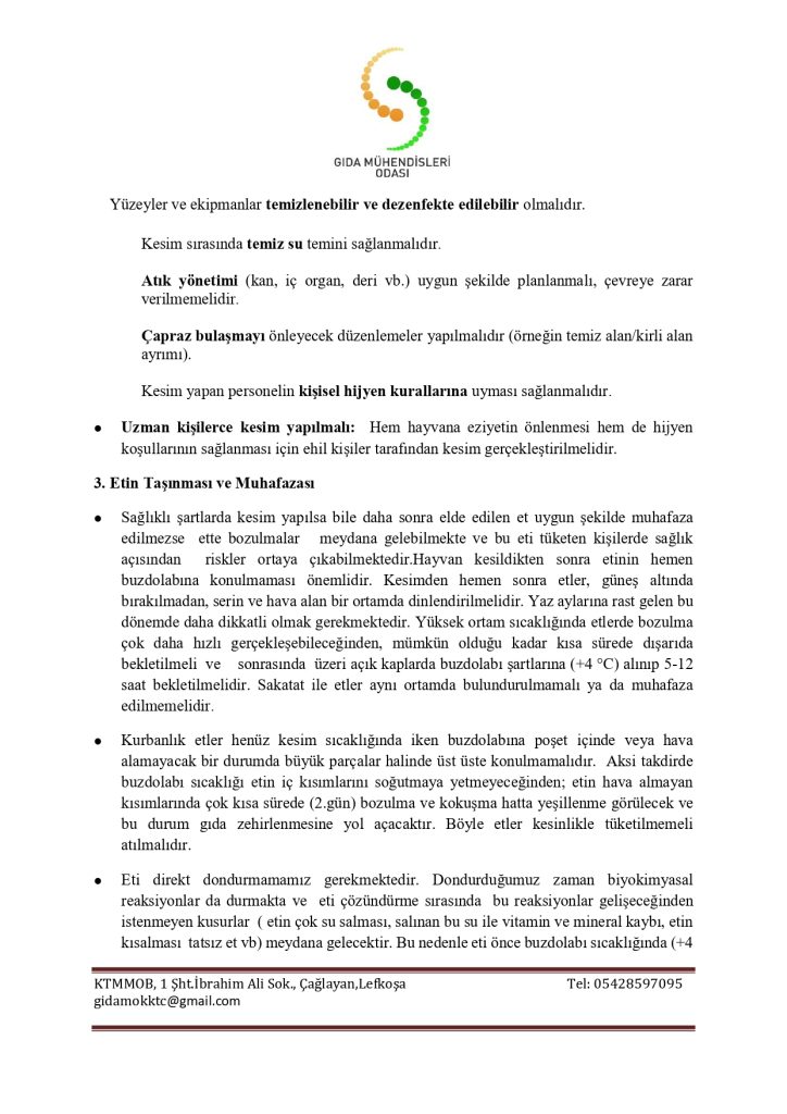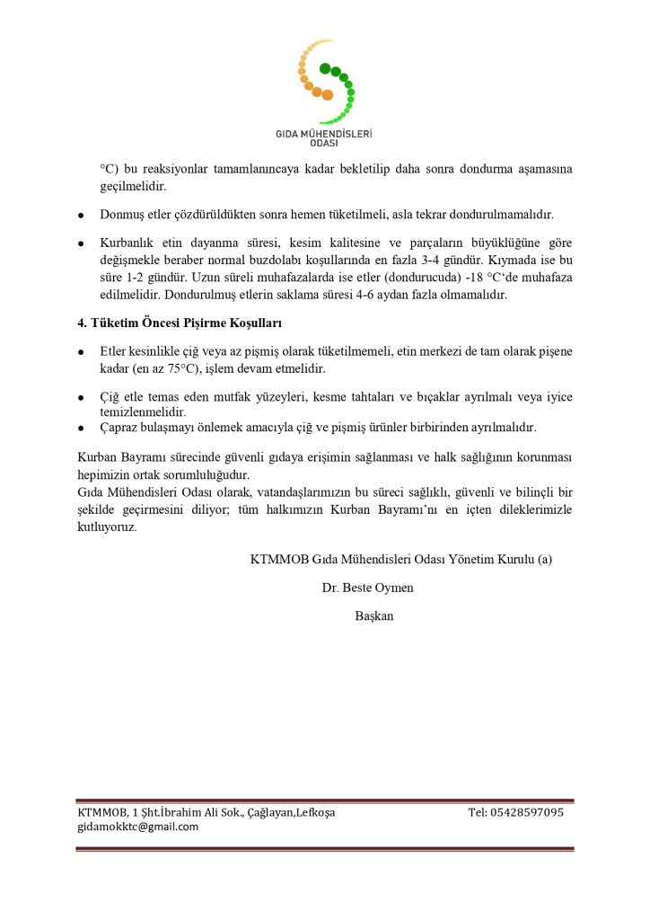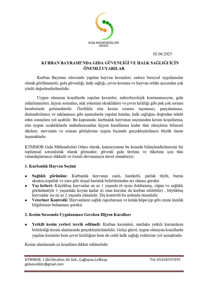 Gıda Mühendisleri Odası olarak, vatandaşlarımızın bu süreci sağlıklı, güvenli ve bilinçli bir şekilde geçirmesini diliyor; tüm halkımızın Kurban Bayramı’nı en içten dileklerimizle kutluyoruz.