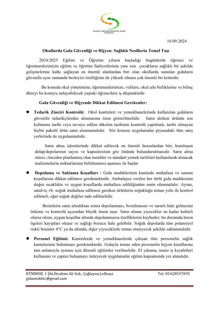 2024/2025 Eğitim ve Öğretim yılının başladığı bugünlerde öğrenci ve öğretmenlerimizin eğitim ve öğretim faaliyetlerinin yanı sıra çocukların sağlıklı bir şekilde gelişmelerine katkı sağlayan en önemli alanlardan biri olan okullarda sunulan gıdaların güvenilir aynı zamanda besleyici özelliğinin de yüksek olması çok önemli bir kriterdir.