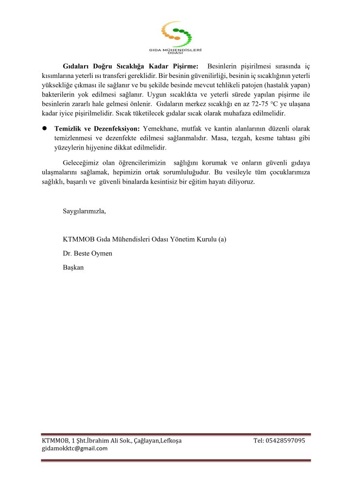 Geleceğimiz olan öğrencilerimizin sağlığını korumak ve onların güvenli gıdaya ulaşmalarını sağlamak, hepimizin ortak sorumluluğudur. Bu vesileyle tüm çocuklarımıza sağlıklı, başarılı ve güvenli binalarda kesintisiz bir eğitim hayatı diliyoruz.