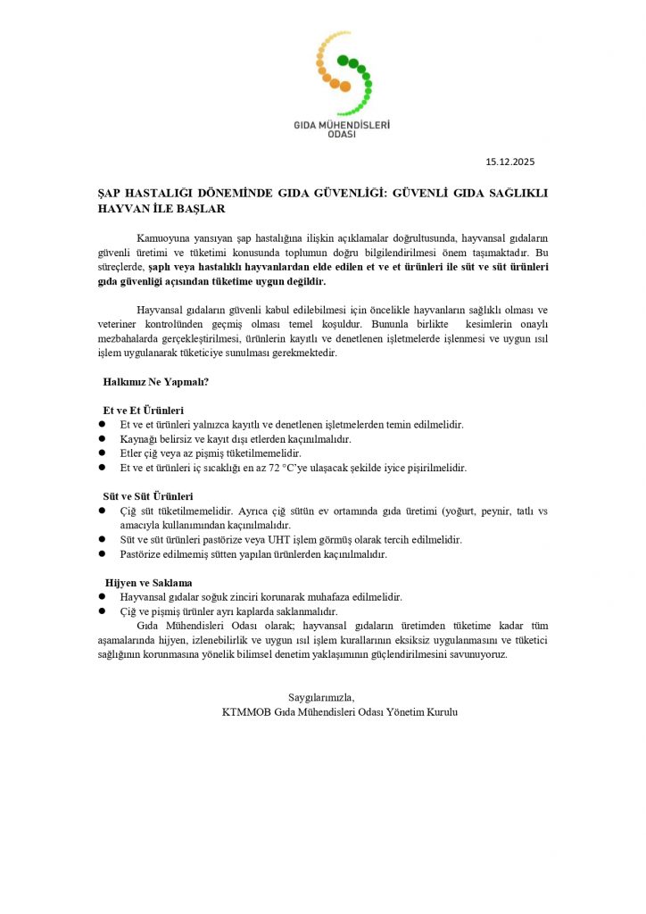 Gıda Mühendisleri Odası olarak; hayvansal gıdaların üretimden tüketime kadar tüm aşamalarında hijyen, izlenebilirlik ve uygun ısıl işlem kurallarının eksiksiz uygulanmasını ve tüketici sağlığının korunmasına yönelik bilimsel denetim yaklaşımının güçlendirilmesini savunuyoruz.