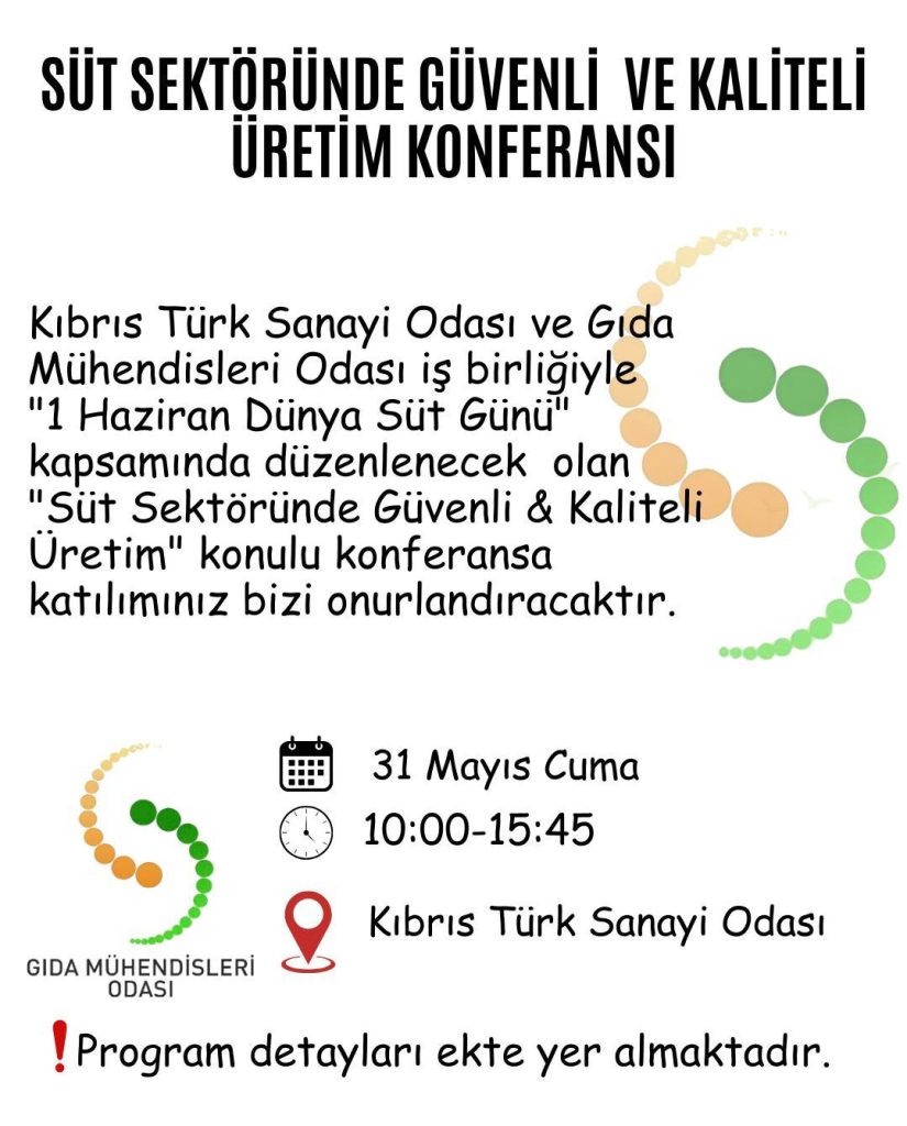 KTMMOB’ye bağlı Gıda Mühendisleri Odası ve K.T. Sanayi Odası işbirliğiyle “1 Haziran Dünya Süt Günü” kapsamında “Süt Sektöründe Güvenli ve Kaliteli Üretim” konulu konferans düzenlenecek.