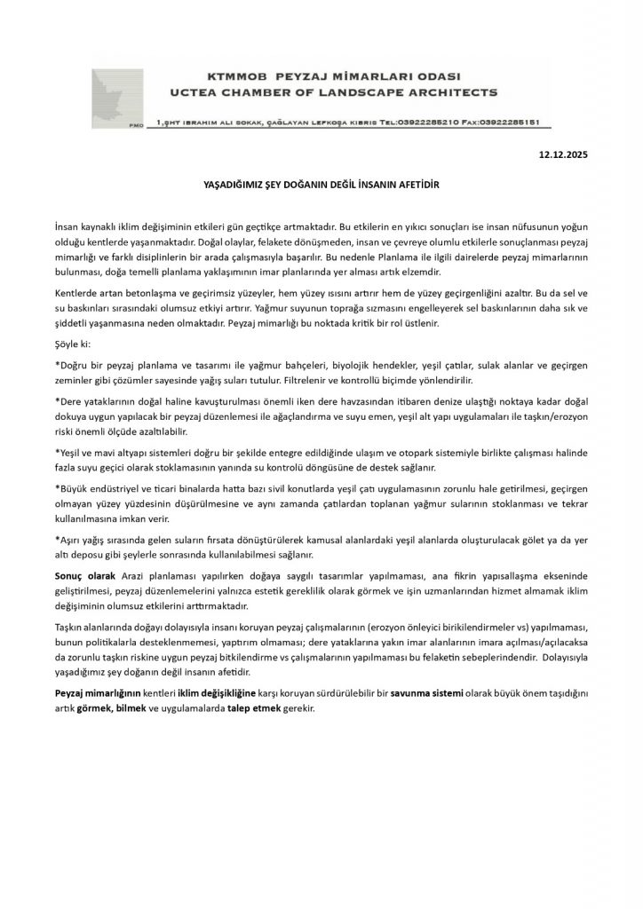 Taşkın alanlarında doğayı dolayısıyla insanı koruyan peyzaj çalışmalarının (erozyon önleyici birikilendirmeler vs) yapılmaması, bunun politikalarla desteklenmemesi, yaptırım olmaması; dere yataklarına yakın imar alanlarının imara açılması/açılacaksa da zorunlu taşkın riskine uygun peyzaj bitkilendirme vs çalışmalarının yapılmaması bu felaketin sebeplerindendir. Dolayısıyla yaşadığımız şey doğanın değil insanın afetidir.