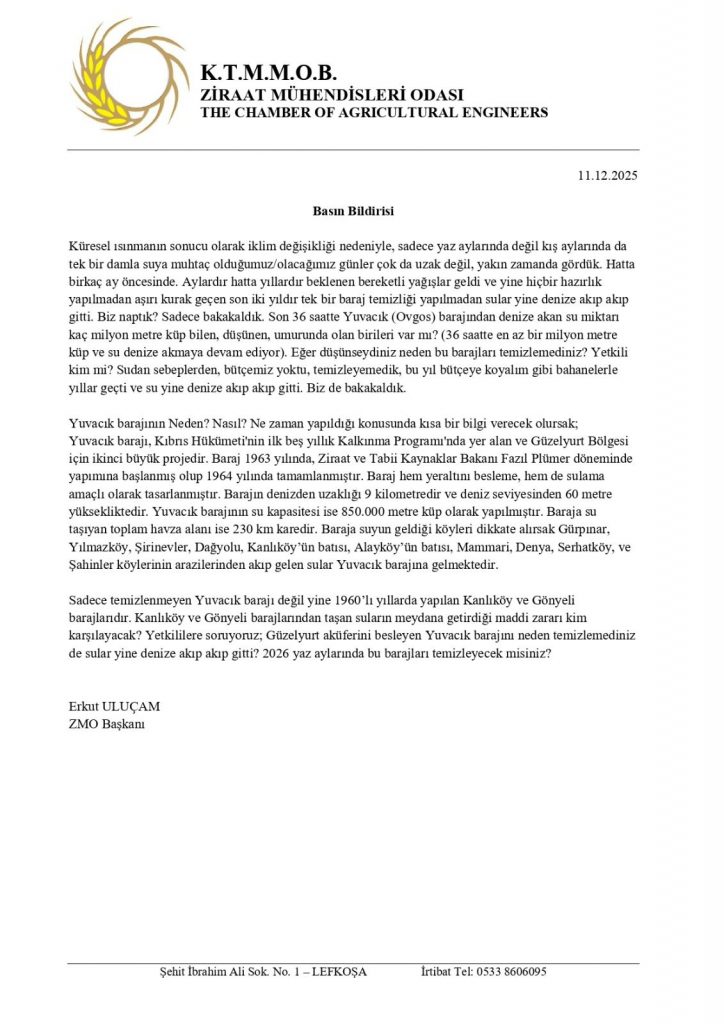 Sadece temizlenmeyen Yuvacık barajı değil yine 1960’lı yıllarda yapılan Kanlıköy ve Gönyeli barajlarıdır. Kanlıköy ve Gönyeli barajlarından taşan suların meydana getirdiği maddi zararı kim karşılayacak? Yetkililere soruyoruz; Güzelyurt aküferini besleyen Yuvacık barajını neden temizlemediniz de sular yine denize akıp akıp gitti? 2026 yaz aylarında bu barajları temizleyecek misiniz?